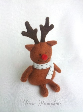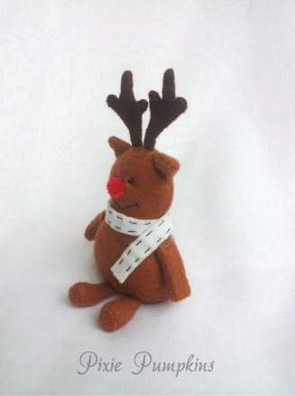 Rudolph is made of brown, dark brown, white felt with beaded eyes, embroidered smile and wears a white felt scarf to keep him warm this festive season. He is stuffed with polyester filling and his arms are thread jointed. He measures approximately 13.5 cm tall to the top of his antlers.