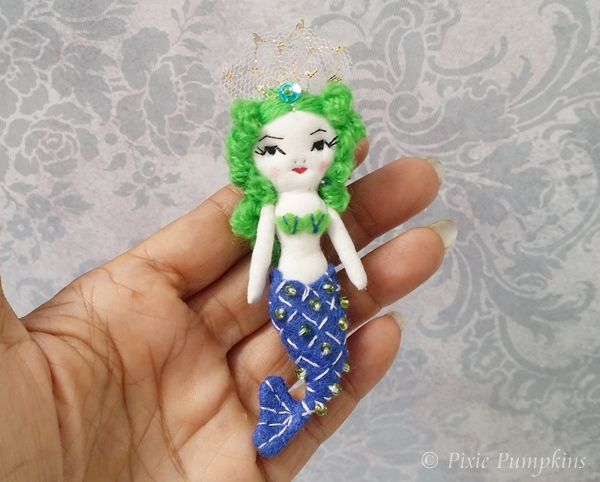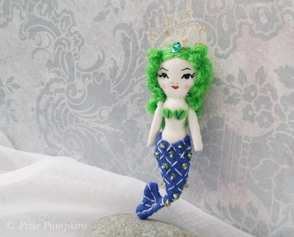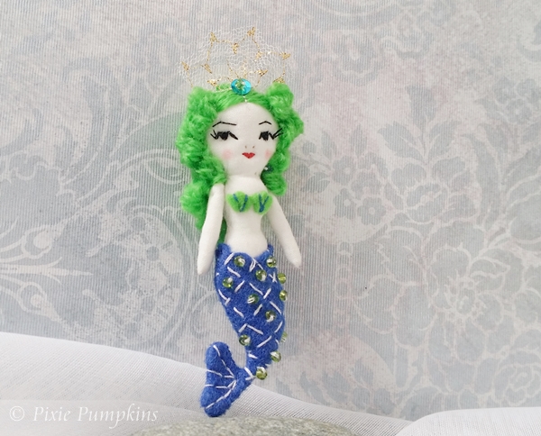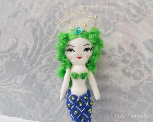 Her tail is made of blue felt and embroidered with beads.