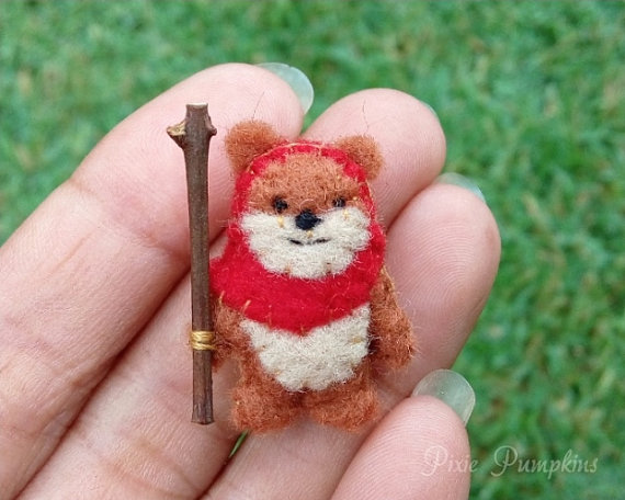 My creation of this adorable Ewok has the cutest expression and wears red felt hood. This cute tiny Ewok stuffed plush measures 2.8 cm tall. Created with dozens of tiny stitches and made with great attention to detail. He is hand sewn using felt and stuffed with polyester fiber. The sweet little face is detailed with embroidery thread and he holds a wooden stick.