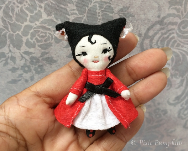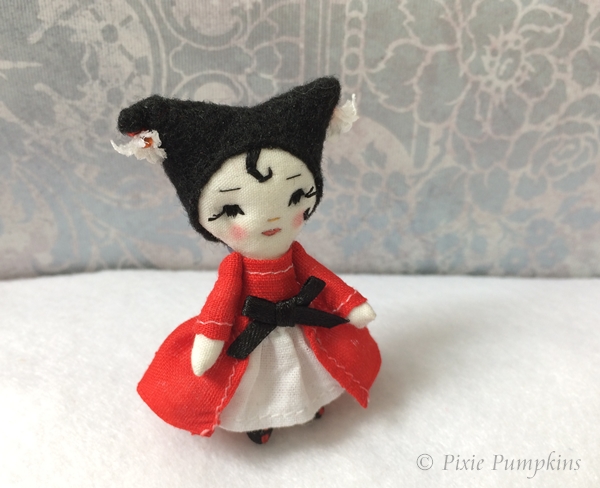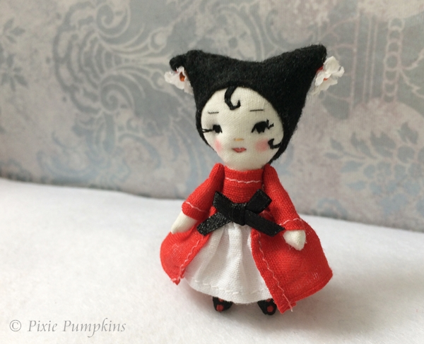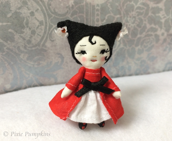 Made from cotton fabric and stuffed with polyester fiber. The sweet little face is hand embroidered with much care and attention to detail. This Jane has black curly fringe and a black felt cap with flowers and beads at the tips of the cap. She wears a red and white dress with black ribbon bow and acrylic painted black shoes with red dots.