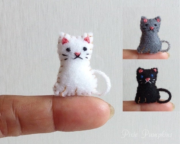 This cute tiny cat stuffed plush measures 2.5 cm tall. Created with dozens of tiny stitches and made with great attention to detail. It is hand sewn using felt and stuffed with polyester fiber. The sweet little face is detailed with embroidery thread and the tail is made of wool yarn.